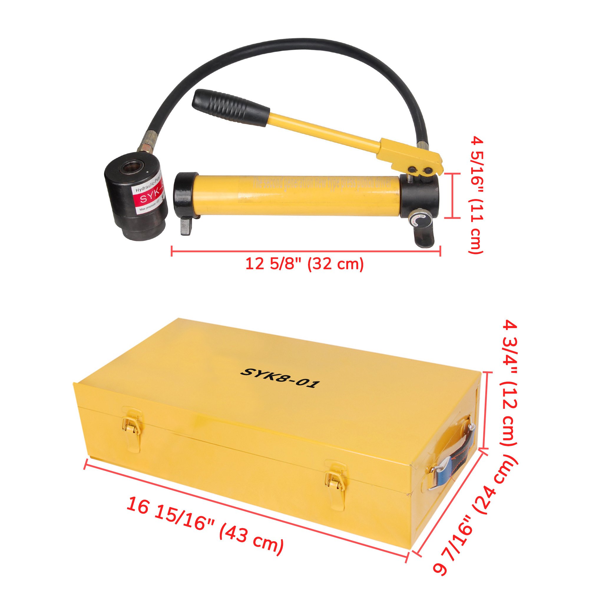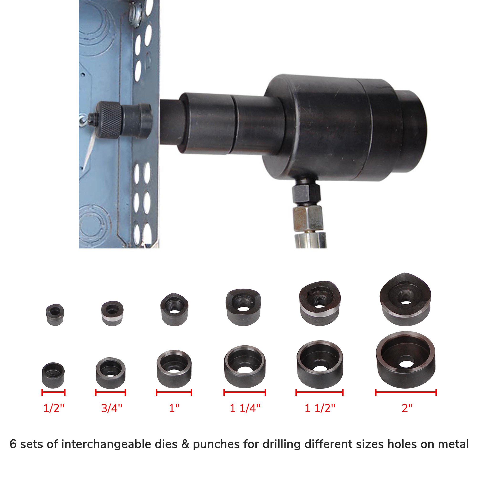 - Complete Punch Tools - Hydraulic punch tool kit features 1pc 10-ton pump; 2pcs draw studs; 1pc piston shaft; 2pcs spacers and 6 sets of interchangeable dies & punches fitting for 1/2"; 3/4"; 1"; 1 1/4"; 1 1/2" and 2" conduit sizes; can drill different sizes holes on stainless steel; iron; steel; aluminum; plastic; etc; 1/8' (11 gauge) max punching thickness for iron and 1/16' (16 gauge) for stainless steel; perfect to be used for different drilling projects