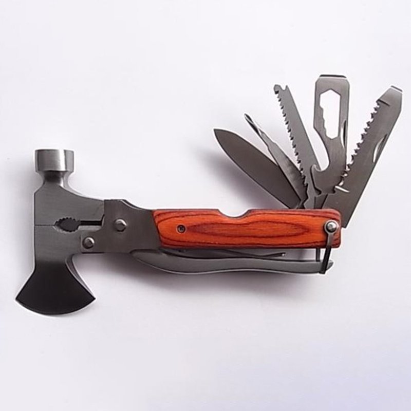 [Main tools]: 1. Pliers; 2. Phillips screwdriver; 3. Double-sided poke knife; 4. Wood saw blade; 5. Knife; 6. Bottle opener; 7. Word screwdriver; 8. Cork stopper; . wire cutter; 10. axe; 11. hammer and self-defense and other functions